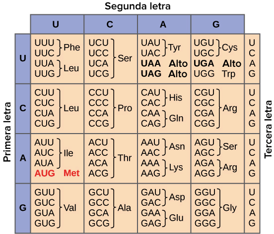 Código GenéticoOnline version A partir de una secuencia de ARNm establezca la secuencia de aminoácidos correspondiente. by Adriana Ospina Correa 1 De acuerdo con el código genético de la imagen (haga click en la lupa para aumentar), ordene la secuencia de aminoácidos que corresponda a la siguiente secuencia de ARNM: AUG GAA ACG CUU GCA UAC UAA. GLU (Glutamina) TYR (Tirosina) THR (Treonina) LEU (Leucina) MET (Metionina) ALA (Alanina) STOP
