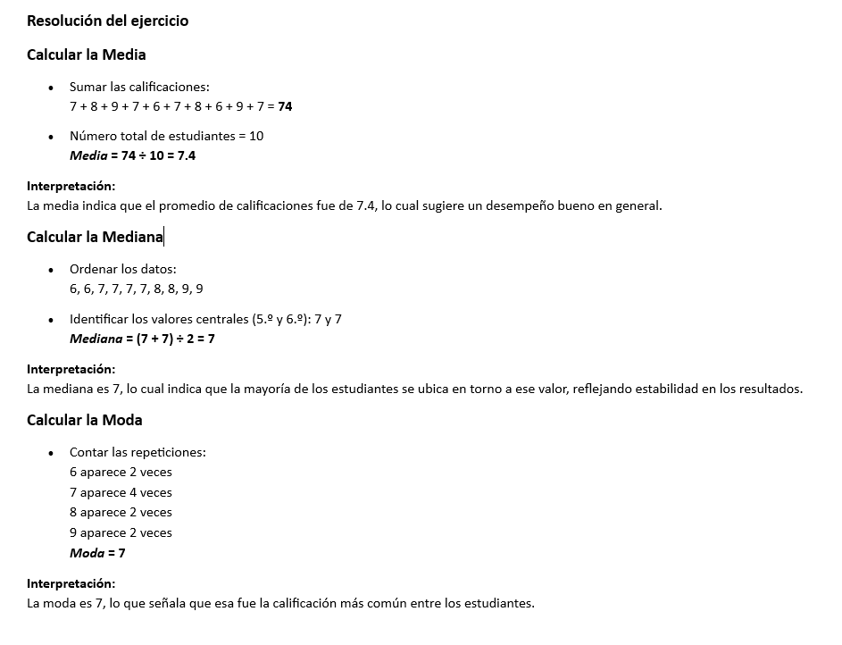 Ejemplo: Si tres estudiantes obtienen 7, 8 y 9 en una prueba, la media es (7+8+9)/3 = 8.