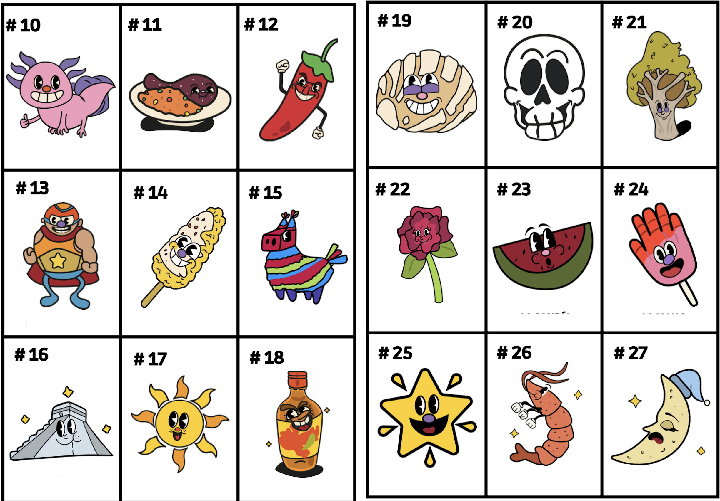 Lotería 3Online version Vocab review lotería by Nate Wolf 1 El chile 2 El luchador 3 La piñata 4 La pirámide 5 El axolote 6 El elote 7 El mole 8 El sol 9 La salsa 10 La rosa 11 La luna 12 La concha 13 El camarón 14 La mano 15 La calavera 16 La sandía 17 El árbol 18 La estrella