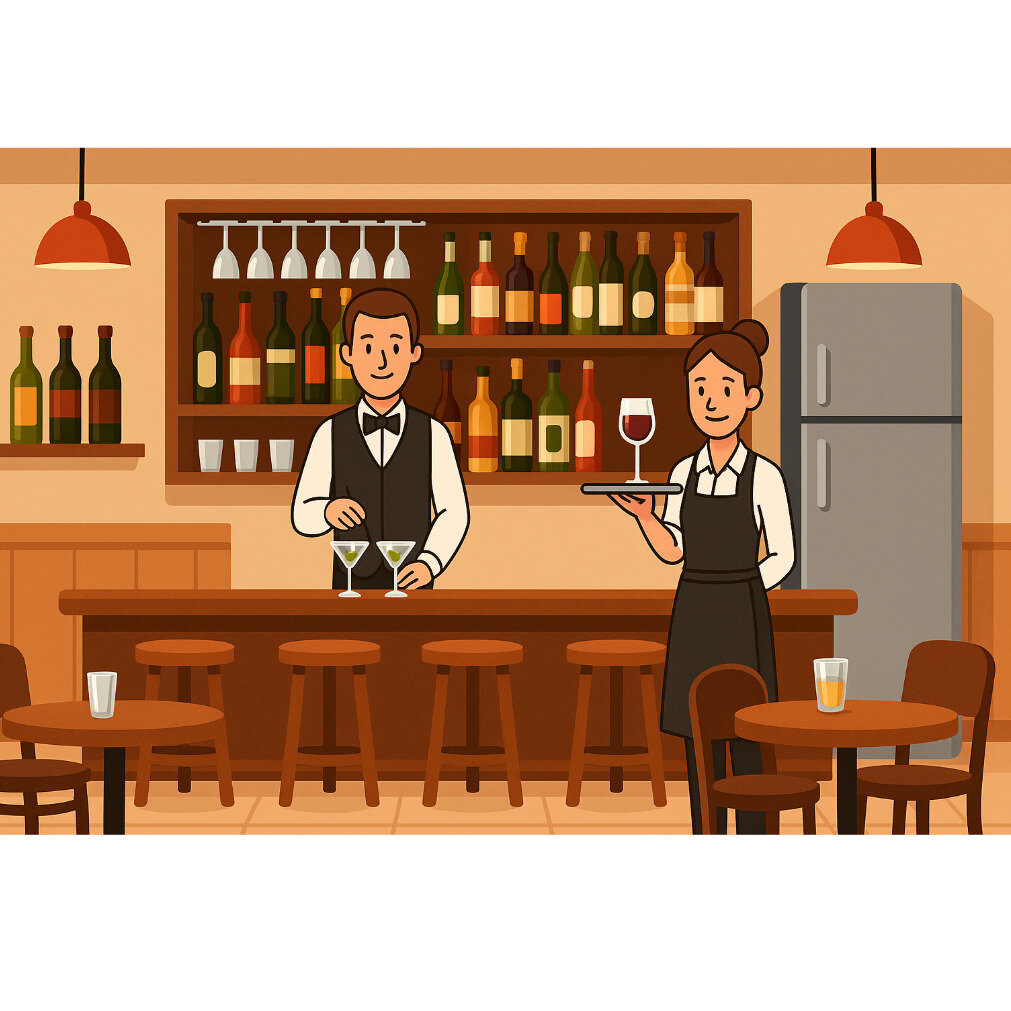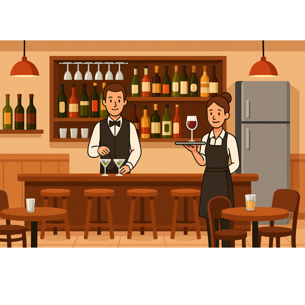P.7exc.7Prepositions_of_placeOnline version Use the image to identify if each statement is correct and write a “T” if true or a “F” if false. by JEspeaking 1 There is a glass on the round table near the fridge. Yes No 2 The waiter is in front of the bar. Yes No 3 The waitress is next to the fridge. Yes No 4 The fridge is between the waiter and the waitress. Yes No 5 The wine bottles are above the bar counter. Yes No 6 The two martini glasses are on the bar. Yes No 7 The white mug is under the table. Yes No 8 The stools are in front of the bar. Yes No 9 The glass of juice is on the floor. Yes No 10 The hanging lights are above the waiters’ heads. Yes No