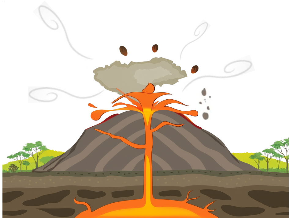 Volcano LabellingOnline version Labelling the parts of a volcano by Zahrah 1 Magma 2 Magma Chamber 3 Pipe 4 Crater 5 Volcanic Cone 6 Ash, dust and gas 7 Lava 8 Volcanic bombs Explanation 1 Good Job! Magma is hot molten rocks in the magma chamber. 2 Good Job! The magma chamber is the reservoir where magma is stored inside the volcano. 3 Good Job! The pipe is the chimney-like column inside the volcano that carries magma to the top. 4 Good Job! The crater is the top opening of the volcano where the eruption occurs. 5 Good Job! The volcanic cone is the mountain-like shape that forms after many eruptions. 6 Good job! Ash,dust and gas are blown up in the air in the form of a big volcanic cloud during an eruption 7 Good Job! Magma that comes out of the crater; flows as lava. 8 Good Job! Volcanic bombs are lava that solidifies quickly.