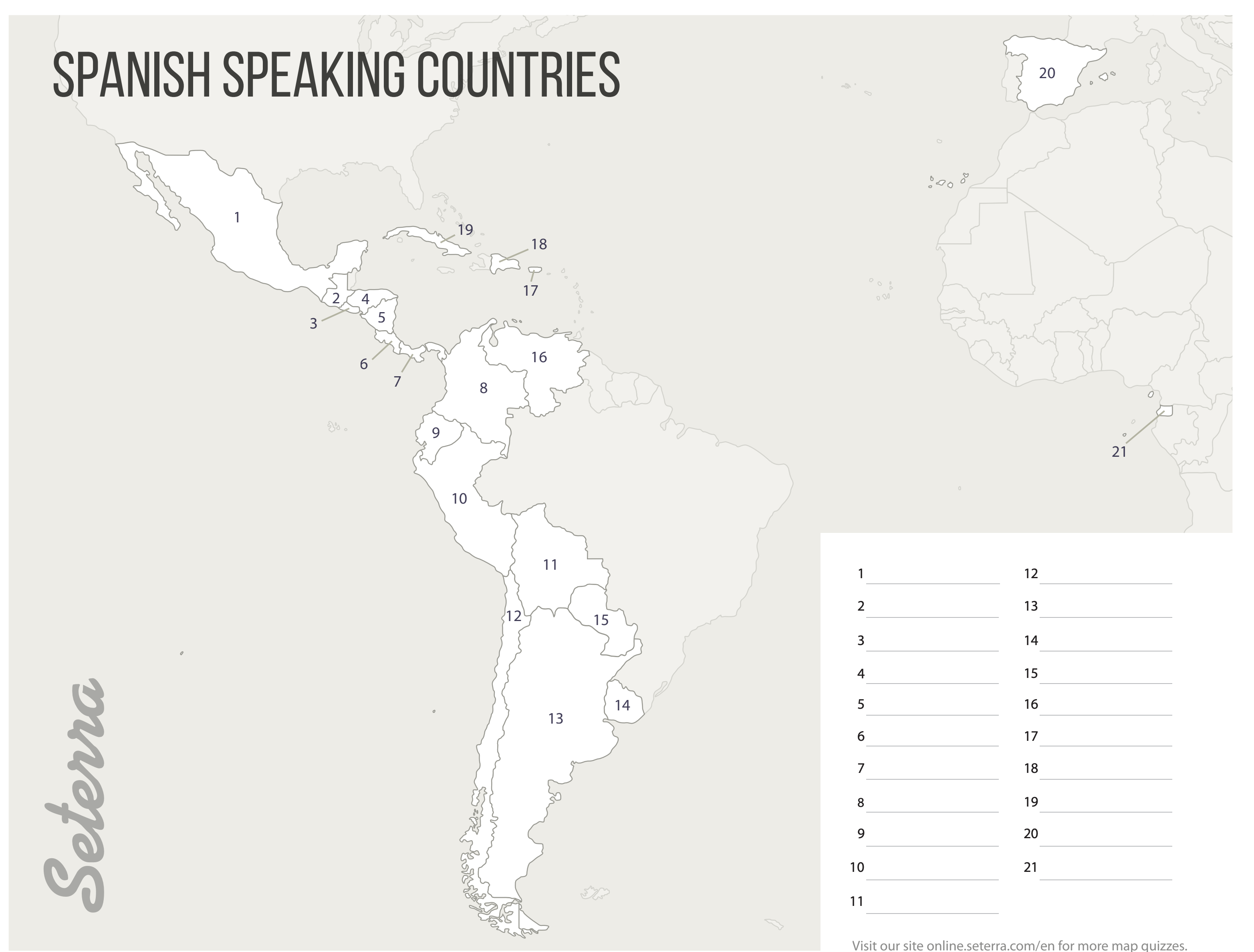 21 Spanish Speaking CountriesOnline version Identify 21 Spanish Speaking Countries by Deidre Singleton 1 Mexico 2 Guatemala 3 El Salvador 4 Honda 5 Nicaragua 6 Costa Rica 7 Panama 8 Colombia 9 Ecuador 10 Peru 11 Bolivia 12 Chile 13 Argentina 14 Uruguay 15 Paraguay 16 Venezuela 17 Puerto Rico 18 Dominican Republic 19 Cuba 20 Spain 21 Equatorial Guinea