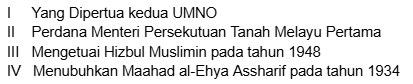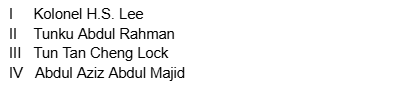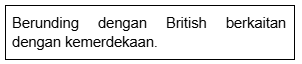 Froggy Jumps Sejarah Tahun 5 - Sejarah KemerdekaanOnline version Sejarah Kemerdekaan I. Tokoh-tokoh Pejuang Kemerdekaan II. Usaha-usaha ke arah Menuntut Kemerdekaan III. Detik-detik Pengisytiharan Kemerdekaan by Ivynalia Lim 1 Siapakah yang memimpin Kesatuan Rakyat Indonesia Semenanjung (KRIS)? a Abu Bakar al-Baqir b Ahmad Boestamam c Dr. Burhanuddin al-Helmi 2 Antara berikut, pernyataan yang manakah benar tentang Abu Bakar al-Baqir? a III dan IV b II dan III c I dan II 3 Siapakah tokoh yang dilantik menjadi Menteri Kewangan Persekutuan Tanah Melayu yang pertama? a Tun Tan Cheng Lock b Tun H.S. Lee c Dato' Onn bin Ja'afar 4 Apakah peristiwa yang menyebabkan darurat diisytiharkan pada tahun 1948? a Pendudukan Jepun b Ancaman Komunis c Malayan Union 5 Apakah peristiwa perjuangan yang tepat dengan pernyataan ini? a Malayan Union b Rundingan London c Ancaman komunis 6 Mengapakah Rundingan London diadakan? a Rundingan berkaitan kemerdekaan b Berjumpa wakil British c Lawatan sambil belajar 7 Siapakah wakil Parti perikatan yang terlibat dengan rombongan kemerdekaan? a III dan IV b II dan III c I dan II 8 Di manakah Tunku Abdul Rahman menyempurnakan pengisytiharan kemerdekaan? a Padang Banda Hilir b London c Stadium Merdeka 9 Perkataan "Merdeka" dilaungkan sebanyak berapa kali? a 7 b 8 c 9 10 Bilakah tarikh Hari Kemerdekaan? a 29 Ogos 1957 b 30 Ogos 1957 c 31 Ogos 1957