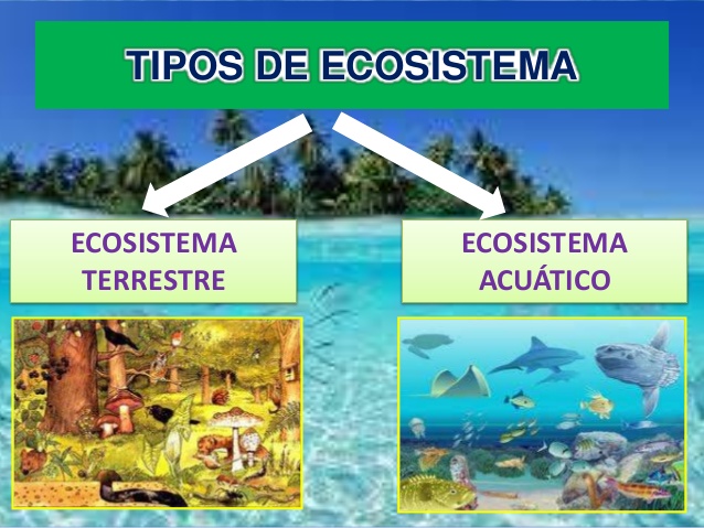 Los ecosistemas pueden ser de dos tipos: terrestres (bosques, selvas, sabanas, desiertos, polos, etc.) y acuáticos (comprenden desde un charco hasta los océanos, mares, lagos, lagunas, manglares, arrecifes coralinos, etc.).