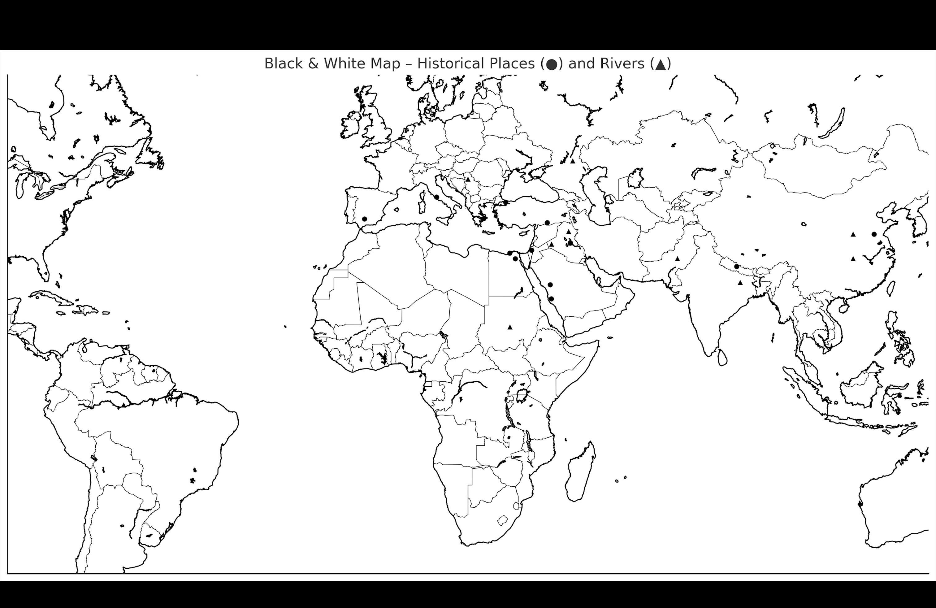 Maps 101Online version guide for first quiz by Amos Liles 1 Nile 2 Alexandria 3 Cairo 4 Jerusalem 5 Euphrates 6 baghdad 7 tigris 8 Medina 9 Mecca 10 Amazon 11 Gobekli Tepe 12 Athens 13 Constantinople 14 Rome 15 Danube 16 Volga 17 Indus 18 ganges 19 Nepal 20 Yellow 21 Yangtze 22 Lu(China) 23 Cordoba