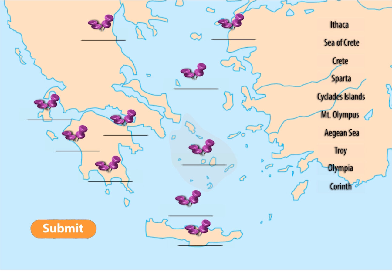 The Olympics: Map 2Online version The Olympics: Map 2 by Allison Bayles 1 Mt. Olympus 2 Troy 3 Aegean Sea 4 Ithaca 5 Corinth 6 Olympia 7 Sparta 8 Cyclades Islands 9 Sea of Crete 10 Crete