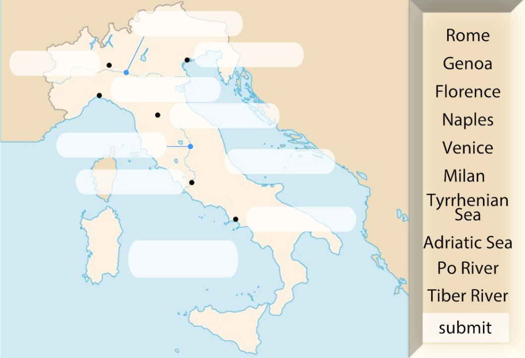Founding Rome MapOnline version Founding Rome Map by Allison Bayles 1 Tyrrhenian Sea 2 Po River 3 Tiber River 4 Adriatic Sea 5 Milan 6 Naples 7 Genoa 8 Venice 9 Rome 10 Florence