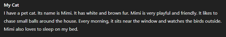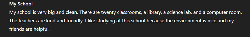 Froggy Jumps Descriptive text QuizOnline version Exercise by Ms Nizzzza 1 How many classrooms are in the school? a Ten b Twenty c Fifteen 2 What room is used for science experiments? a Library b Computer room c Science lab 3 What are the teachers like? a Kind and friendly b Lazy and boring c Funny and strict 4 Why does the writer like studying at this school? a Because the environment is nice b Because there are few students c Because it is near home 5 What is the purpose of the text? a To describe a school b To invite someone to school c To tell about a trip 6 What kind of animal is Mimi? a A cat b A rabbit c A dog 7 What color is Mimi's fur? a Yellow and grey b Black and white c White and brown 8 Where does Mimi like to sleep? a On the sofa b In the garden c On the bed 9 What does Mimi like to chase? a Insects b Birds c Small balls 10 The text mainly tells us about … a The writer's cat b The writer's hobby c The writer's favorite animal