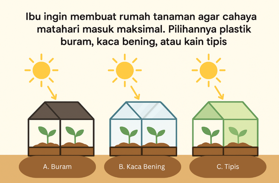 Soal HOTS - Kelas 5 Bab 7Online version Berikut ini adalah soal-soal HOTS dari bab 7 mengenai Cahaya pada kelas 5 SD by IMAM MURTADHO 1 Lita heran melihat bayangannya di air tampak tidak jelas, bergelombang, dan menyesuaikan dengan riak di permukaan. Mengapa bayangan di air berbeda dengan bayangan di cermin datar…. a Air menyerap sebagian cahaya b Cermin datar memantulkan cahaya secara acak c Permukaan air tidak rata sehingga memecah arah cahaya d Cahaya tidak bisa menembus air 2 Bayu ingin membuat lampu belajar yang cahayanya terfokus ke buku tanpa menyebar ke seluruh ruangan. Dengan memanfaatkan cermin, jenis cermin mana yang paling tepat digunakannya…. a Cermin datar karena memantulkan cahaya ke satu arah b Cermin cekung karena memusatkan cahaya ke satu titik c Cermin cembung karena menyebarkan cahaya ke seluruh ruangan d Cermin datar karena memperjelas bayangan benda 3 Ibu ingin membuat rumah tanaman agar cahaya matahari masuk secara maksimal. Pilihannya yaitu plastik buram, kaca bening, atau kain tipis. Bahan mana paling tepat digunakan…. a Plastik buram, karena tahan panas dan menyerap cahaya b Kaca bening, karena transparan dan memungkinkan cahaya masuk langsung c Kain tipis, karena fleksibel dan menyebarkan cahaya d Plastik buram, karena memantulkan cahaya ke tanaman 4 Saat memperhatikan pensil di dalam air, pensil tampak bengkok, seolah-olah terputus. Fenomena apakah yang menyebabkan hal itu…. a Cahaya dari pensil dipantulkan oleh air b Cahaya dari pensil dibelokkan saat melewati batas antara air dan udara c Cahaya dari pensil diserap oleh air d Cahaya dari pensil tidak bisa menembus air 5 Dari gambar diatas seorang Peserta didik ingin mengamati detail pada serat daun dengan lebih jelas. Alat optik mana yang sebaiknya dipilih.... a Kaca pembesar, karena memperbesar bayangan benda kecil b Cermin datar, karena memantulkan bayangan sesuai ukuran benda c Lensa prisma, karena membiaskan cahaya ke berbagai arah d Cermin cekung, karena memperbesar bayangan benda