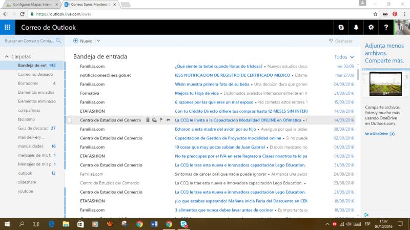 Pantalla de OutlookOnline version Completa las partes de la pantalla de Outlook. by Jose Martin Revelo Montero 1 Bandeja de entrada en la cual se reciben correos electronicos 2 Menu despleglable para cambiar entre contactos, calendarios, skype,etc 3 Carpetas donde se encuentran los variados tipos de correos 4 Lugar donde se puede empezar un nuevo correo, o cambiar al calendario 5 Configuracion de la cuenta como Cambiar temas o los correos 6 Buscador, sirve para buscar en la web y en los correos 7 Botón para cambiar rápidamente a skype 8 Botón desplegable para ver las notificaciones 9 Botón para filtrar correos electrónicos 10 Botón para ver las notificaciones 11 Lugar donde se puede cerrar cesión o editar la cuenta
