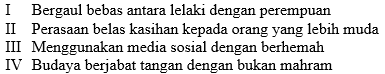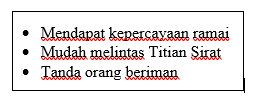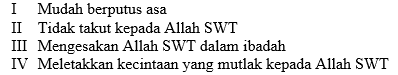 Froggy Jumps Kuiz Pendidikan Islam Tingkatan 1Online version Menguji minda dalam mengingati tajuk-tajuk yang diajar by Sazah Syafiqah 1 Antara yang berikut yang manakah bukti Islam agama yang tinggi? a Mengatasi ilmu dan kajian manusia b Berubah mengikut peredaran zaman c Tidak berpandukan mana-mana sumber 2 Nabi Adam a.s. diciptakan daripada _________________. a api b tanah c cahaya 3 Maksud wuduk dari segi bahasa ialah __________________. a suci dan bersih b keelokan peribadi c bersih, elok dan berseri 4 Pilih pernyataan yang benar ciri orang yang beriman. a I dan II b II dan III c III dan IV 5 Perbuatan di atas merujuk kepada ___________________. a rukun fi'li b rukun qauli c sunat hai'ah 6 Pilih nama Allah SWT yang menunjukkan Allah SWT Maha Melihat. a an-nur b al-basir c al-malik 7 Pilih cara bacaan yang betul bagi kalimah bergaris di atas a Dibaca tanpa mad atau tidak dipanjangkan b Dibaca panjang dua harakat c Dibaca panjang enam harakat 8 Q dalam rajah di atas merujuk kepada __________________. a Ijmak b Al-Quran c Hadis Qudsi 9 Antara yang berikut yang manakah usaha Khalifah Uthman bin Affan r.a. untuk meningkatkan pendapatan rakyat? a Menubuhkan Baitulmal b Meneruskan kutipan Jizyah c Memberi peluang pekerjaan 10 _________________ ialah kemuncak hubungan manusia dengan Allah SWT a solat b puasa c menutup aurat 11 'Hawa menunaikan solat semasa sedang haid' Hukum perbuatan Hawa ialah _______________. a haram b sunat c wajib 12 Pilih pernyataan yang benar cara menjaga maruah diri dari aspek tingkah laku a I dan II b II dan III c III dan IV 13 Pakaian yang terkena najis dan dibasuh dengan sabun tetapi tidak menggunakan air mutlak. a Bersih tetapi tidak suci dan tidak boleh digunakan untuk solat b Tidak bersih tetapi suci dan boleh digunakan untuk solat c Bersih tetapi suci dan boleh digunakan untuk solat 14 Pilih padanan yang betul di bawah. a Sumber - Disimpan di tempat yang suci b Proses - Disembelih mengikut hukum syarak c Kandungan - Diperoleh dengan cara yang sah 15 Antara yang berikut yang manakah benar mengenai agama Hanif? a Agama yang dibawa oleh Nabi Ibrahim a.s. dan Nabi Ismail a.s. b Agama yang mula diperkenalkan oleh Amru bin Amir, c Agama samawi yang diubah suai daripada ajaran Nabi Isa a.s. mengikut keinginan penganutnya 16 Pilih pernyataan yang benar kesan tidak beristinjak dengan sengaja. a Diampunkan dosa b Ibadah yang dilakukan tidak sah c Terhindar daripada jangkitan penyakit 17 Pernyataan di atas merujuk kepada kepentingan mengamalkan sifat _________________. a amanah b ikhlas c sabar 18 Antara yang berikut yang manakah boleh digunakan untuk mengangkat hadas kecil dan hadas besar sebagai ganti kepada air? a tisu b kertas c debu tanah 19 Berapakah basuhan air mutlak yang diperlukan bagi menyucikan najis mughallazah a 5 b 6 c 7 20 Pengucapan _____________________ menjadi asas akidah seseorang Muslim. a istiazah b syahadah c basmalah