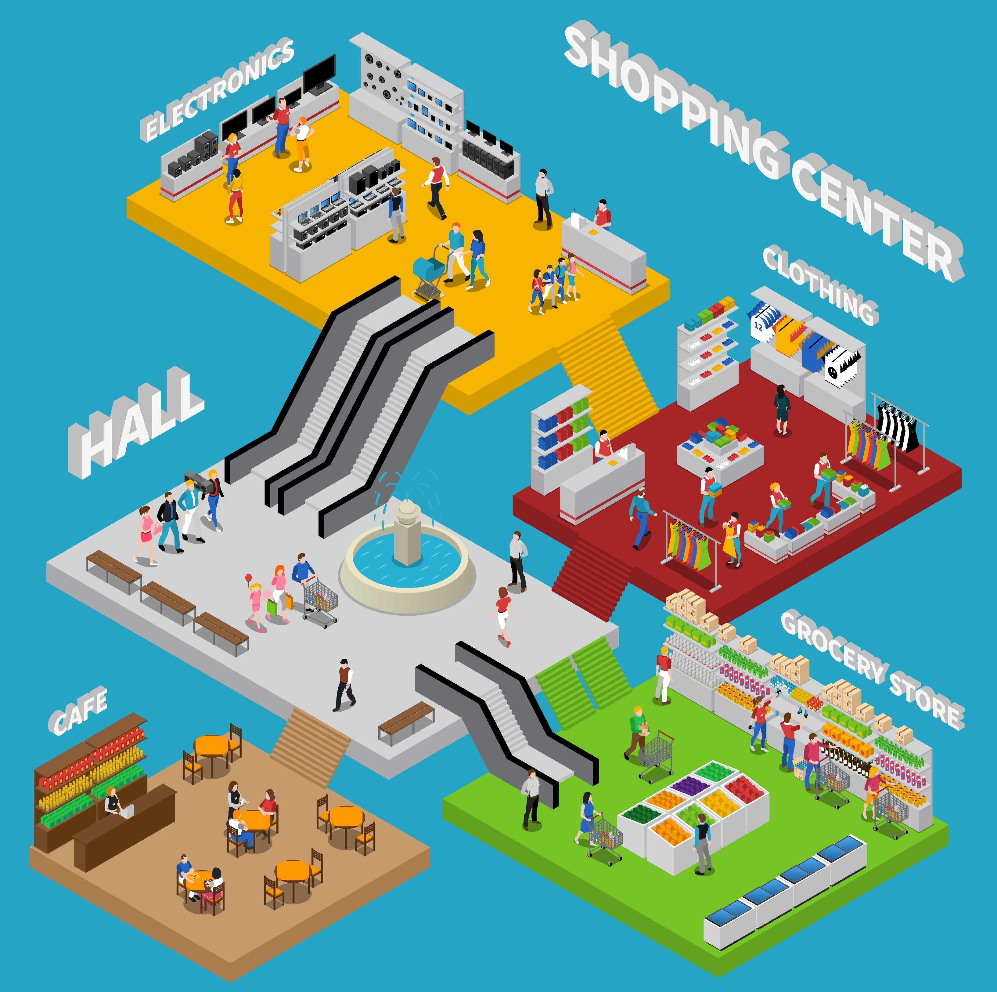 SUP2 U6.2 | Reading mapOnline version Map game - Shopping center by Han Tran 1 Where is the cafe? What can you do here? 2 Where is the grocery store? What can you do here? 3 Where is the hall? What can you do here? 4 Where is the clothing store? What can you do here? 5 Where is the electronics store? What can you do? 6 What is this a map of? Explanation 1 First floor - Drink coffee and tea, etc. 2 First floor - Buy fruits and vegetables, etc 3 Second floor - Sit and relax or wait for friends. 4 Third floor - Buy or try on new clothes and shoes 5 Fourth floor - Buy electronic devices 6 This is a map of a shopping center.