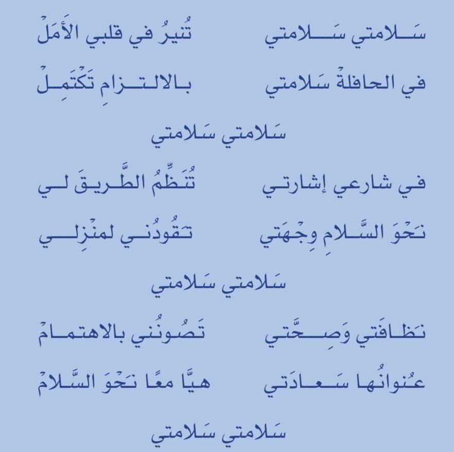 Froggy Jumps نشيد سلامتيOnline version نشاط لنشيد سلامتي by Asmahan alsaadi 1 ماهو عنوان هذا النشيد a علم بلادي b سلامتي c الأمن والأمان 2 تدل الصورة على a سلامتي ف الطريق b سلامتي في الشارع c سلامتي ف المدرسة 3 تدل الصورة على a سلامتي في الشارع b سلامتي ف المنزل c سلامتي في المدرسة 4 تدل الصورة على a سلامتي ف المنزل b سلامتي ف المدرسة c سلامتي ف الشارع 5 البيت الشعري للنشيد المناسب للصورة هو a في شارعي إشارتي تنظم الطريق لي b نظافتي وصحتي تصونني بالاهتمام c في الحافلة سلامتي بالالتزام تكتمل 6 البيت الشعري للنشيد المناسب للصورة a في الحافلة سلامتي بالالتزام تكتمل b نظافتي وصحتي تصونني بالاهتمام c في شارعي إشارتي تنظم الطريق لي 7 البيت الشعري للنشيد والمناسب للصورة a نظافتي وصحتي تصونني بالاهتمام b في شارعي إشارتي تنظم الطريق لي c في الحافلة سلامتي بالالتزام تكتمل