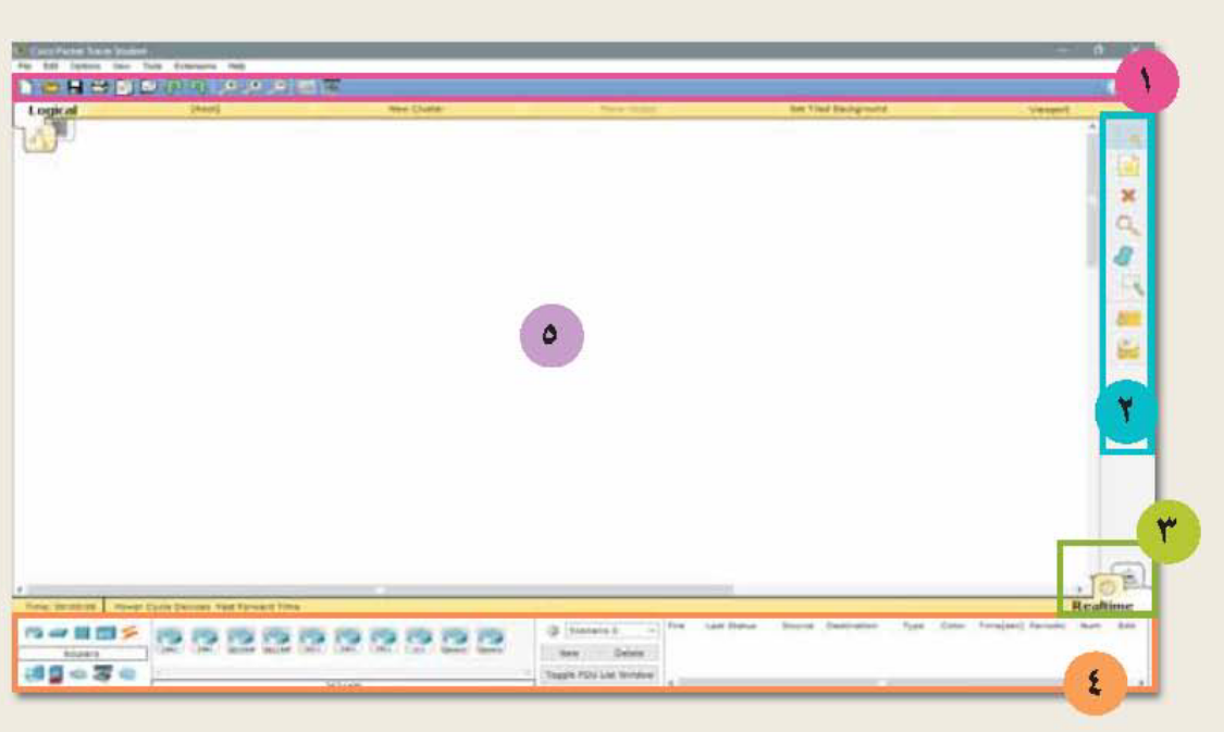 مكونات واجهة برنامج packet TracerOnline version تحديد مكونات واجهةالبرنامج ووصف لكل مكون by Na Aljenebi 1 شريط الأدوات الايمن 2 شريط الأدوات الرئيسي 3 تبويب التبديل بين الوضع الحقيقي ووضع المحاكاة 4 شريط الأدوات السفلي 5 منطقة العمل
