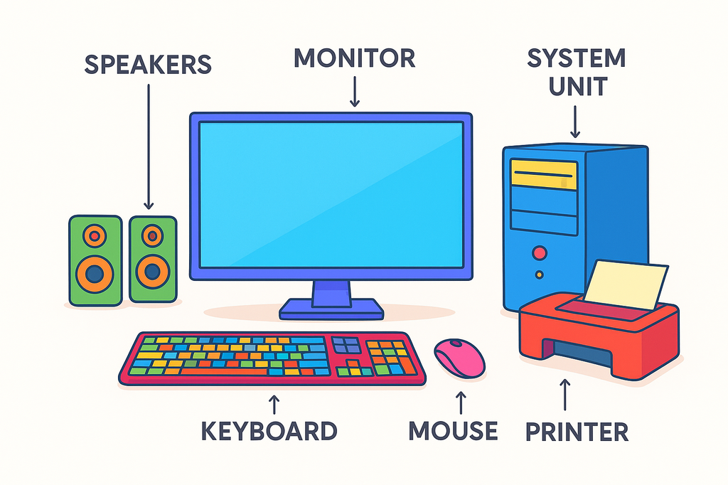 Memory Game Desktop ComputerOnline version Game of parts of the desktop computer by Hema Noyan Keyboard Keyboard Monitor Monitor Desktop Computer Speakers System Unit Desktop Computer Printer Speakers System Unit Mouse Printer Mouse