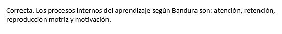 Aprendizaje y EducaciónOnline version A continuación se presentan una serie de preguntas relacionadas con el tema de aprendizaje y educación. Contestar a cada una de las preguntas de opción múltiple sin dejar ninguna en blanco sabiendo que sólo hay una opción correcta. by Paula Moreno Mera 1 Uno de los autores que relacionamos con el Aprendizaje Observacional es: a Skinner b Watson c Pavlov d Bandura 2 Los procesos internos del aprendizaje observacional según Bandura son: atención, retención, reproducción motriz y: a Motivación b Emoción c Percepción d Interacción 3 Recordamos las cosas en conjunto cuando: a Son similares b Se contrastan c Están contiguas d Todas las anteriores son correctas 4 En la ________ se deja de dar la respuesta condicionada a estímulos semejantes (pero no iguales) al estímulo condicionado a Extinción b Discriminación c Habituación d Generalización