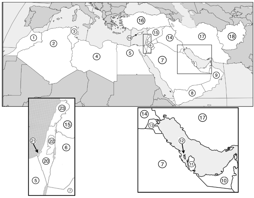 Countries of the Middle East & North AfricaOnline version Countries of the Middle East & North Africa by Benjamin DeMott 1 Morocco 2 Algeria 3 Tunisia 4 Libya 5 Egypt 6 Saudi Arabia 7 Lebanon 8 West Bank 9 Gaza Strip 10 Israel 11 Yemen 12 Oman 13 Bahrain 14 Kuwait 15 Qatar 16 United Arab Emirates 17 Iran 18 Iraq 19 Afghanistan 20 Turkiye 21 Jordan 22 Syria 23 Cyprus