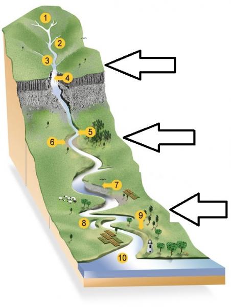 The course of a River. Online version Key concepts about the course of a river. by Matthew Miller 1 Upper Course 2 Middle course 3 Lower course 4 Mouth 5 Source 6 Meander 7 Sea 8 Oxbow lake 9 Waterfall 10 Tributary 11 Levee