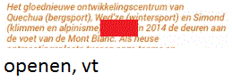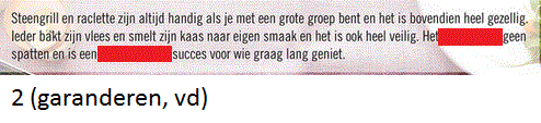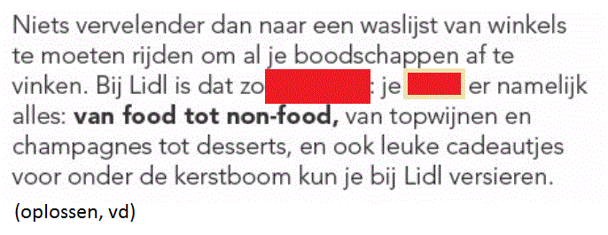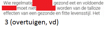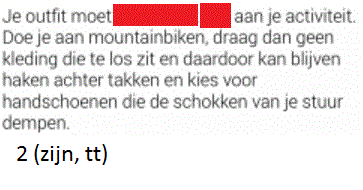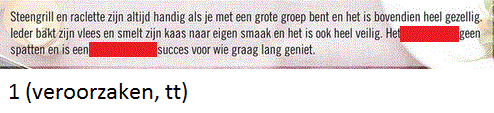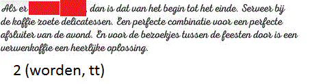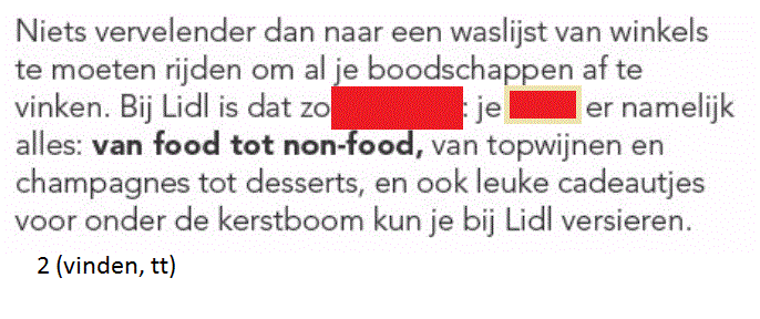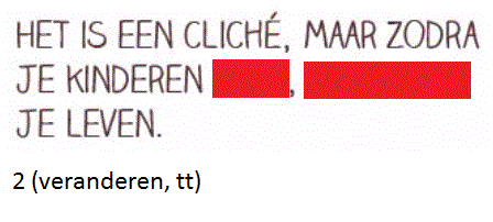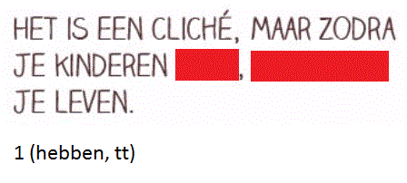 Werkwoorden uit foldersOnline version De afbeeldingen die je te zien zal krijgen komen uit folders. Vul de juiste werkwoorden aan! by Annelies Vanspeybrouck 1 Vul het werkwoord in. Geschreven antwoord 2 Vul het werkwoord in. Geschreven antwoord 3 Vul het werkwoord in. Geschreven antwoord 4 Vul het werkwoord in. Geschreven antwoord 5 Vul het werkwoord in. Geschreven antwoord 6 Vul het werkwoord in. Geschreven antwoord 7 Vul het werkwoord in. Geschreven antwoord 8 Vul het werkwoord in. Geschreven antwoord 9 Vul het werkwoord in. Geschreven antwoord 10 Vul het werkwoord in. Geschreven antwoord 11 Vul het werkwoord in. Geschreven antwoord 12 Vul het werkwoord in. Geschreven antwoord 13 Vul het eerste werkwoord in. Geschreven antwoord 14 Vul het werkwoord in. Geschreven antwoord 15 Vul het werkwoord in. Geschreven antwoord 16 Vul het werkwoord in. Geschreven antwoord Uitleg 1 -t of -d achteraan? Zet het werkwoord in de verleden tijd: ik paste aan (met een t), dus: aangepast. 2 Je outfit moet aangepast zijn. Je outfit is aangepast. Werkwoord zijn komt na vd dus moet de infinitief er staan. 3 wie = derde persoon enkelvoud, stam + t 4 wie = derde persoon enkelvoud, stam + t 5 -t of -d? Werkwoorden vervoegen in verleden tijd: overtuigde --> eindigt op een d dus overtuigd 6 -t of -d? werkwoord feesten vervoegen in de verleden tijd: ik feestte --> eindigt op een t dus gefeest 7 Er wordt gefeest. word + t 8 derde persoon enkelvoud = stam + t 13 -t of -d achteraan? Zet het werkwoord in de verleden tijd: ik loste op, t dus opgelost 14 tweede persoon enkelvoud = stam + t --> je vindt 15 verleden tijd = stam + de/te --> opende 16 vinden tweede persoon enkelvoud voor pv = vind je