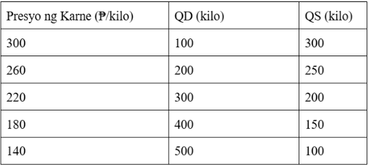 Gawain 2: Unawain mo!Online version Panuto: Basahin at unawain ang sitwasyon at ang talahanayan sa ibaba. Sagutin ang bawat tanong sa pamamagitan ng pagpili ng letra ng iyong sagot. Bilogan lamang ang letra ng iyong sagot sa bawat tanong. Sitwasyon: Sa isang pamilihan, nagbebenta ng karne ng baboy ang mga tindera. Napapansin na kapag tumataas ang presyo, kumokonti ang bumibili, at kapag bumababa ang presyo, dumadami ang bumibili. Ganito rin ang nangyayari sa mga nagtitinda. Kapag mataas ang presyo, mas marami silang gustong ibenta, at kapag mababa ang presyo, mas kaunti ang kanilang inilalabas na paninda. by Vic Ranier 1 Ano ang ipinapakita ng talahanayan tungkol sa relasyon ng presyo at demand? a Walang relasyon ang presyo at demand b Kapag tumataas ang presyo, tumataas ang demand c Kapag tumataas ang presyo, bumababa ang demand d Hindi nagbabago ang demand kahit magbago ang presyo 2 Sa anong presyo pinakamataas ang Quantity Demanded? a ₱300 b ₱260 c ₱180 d ₱140 3 Ano ang mangyayari sa Quantity Supplied kapag bumaba ang presyo ng karne? a Tataas b Babalik sa dati c Bababa d Mananatili 4 Sa presyong ₱220, alin ang tama? a Mas mataas ang QD kaysa QS b Mas mataas ang QS kaysa QD c Pantay ang QD at QS d Walang datos 5 Ano ang tawag sa sitwasyon kung saan mas mataas ang QD kaysa QS? a Equilibrium b Inflation c Shortage d Surplus 6 Sa presyong ₱300, anong sitwasyon ang nagaganap sa pamilihan? a Demand shock b Equilibrium c Shortage d Surplus 7 Alin sa mga sumusunod ang nagpapakita ng batas ng supply? a Kapag mababa ang presyo, mas maraming ibinebenta b Kapag mataas ang presyo, mas kaunti ang ibinebenta c Kapag mataas ang presyo, mas maraming ibinebenta d Walang kinalaman ang presyo sa supply 8 Kung maraming mamimili ang bibili ng karne sa presyong ₱140, anong konsepto ang ipinapakita nito? a Inflation b Law of Demand c Law of Supply d Production cost 9 Ano ang mangyayari sa presyo kung patuloy na mas mataas ang demand kaysa supply? a Tataas ang presyo b Bababa ang presyo c Mananatili ang presyo d Mawawala ang produkto 10 Bakit mahalagang pag-aralan ang interaksyon ng demand at supply? a Para maunawaan kung paano nabubuo ang presyo sa pamilihan b Para malaman ang eksaktong presyo ng lahat ng produkto c Para kontrolin ng mamimili ang mga nagtitinda d Para alisin ang kompetisyon sa pamilihan