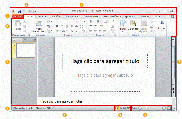 Ventana de Power PointOnline version Elementos de la ventana principal de Power Point by Maria Lourdes Benitez Hurtado 1 Barra de título 2 Cinta de opciones 3 Barra de acceso rápido 4 Grupos de opciones 5 Panel de diapositivas 6 Vistas 7 Barra de desplazamiento 8 Zoom 9 Barra de estado 10 Barra de desplazamiento