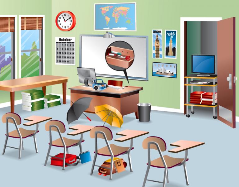 Classroom objectsOnline version Identify classroom objects. by Raquel Juan Baeza 1 Clock 2 Map 3 window 4 calendar 5 door 6 poster 7 computer 8 chair 9 desk 10 CD player 11 TV 12 wall 13 dustbin 14 books 15 notebook 16 backpack 17 umbrella 18 bag 19 scissors 20 paper 21 marker 22 video recorder