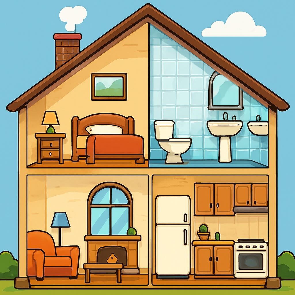 Identify the parts of the house.Online version identifica las partes de la casa. by Yoryanis Siso 1 bathroom 2 livingroom 3 bedroom 4 kitchen 5 Roof