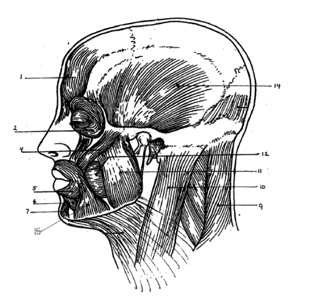 Muscles of the Head and NeckOnline version Labeling, actions, origins, and insertions and head and neck muscles by Paul Uk 1 2 3 4 5 6 7 8 9 10 11 12 1 2 3 4 5 6 7 8 9 10 11 12 Explanation 1 Draws scalp anteriorly; raises eyebrows 2 Closes eyelid 3 Origin: Zygomatic Bone Insertion: Angles/ Corners of mouth Action: Elevates angles of mouth (smiling) 6 Elevates and protrudes lower lip (pouting) 7 depresses angles of mouth (frowning) 8 elevates clavicle and scapula 9 Origins: Sternum and clavicle Insertion: Mastoid process of temporal Actions: Abducts head; neck lateral flexion; rotates head; neck rotation; flexes head; neck flexion 10 Elevates mandible (chewing) 11 Origins: Maxilla and mandible Insertion: orbicularis oris Actions: Compresses cheek; whistling; sucking