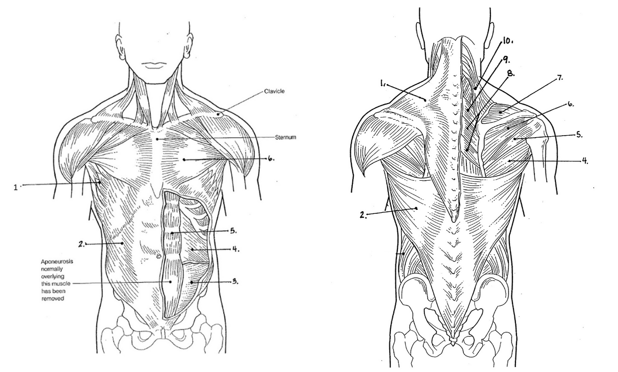 Muscles of the TrunkOnline version Labeling, actions, origins, and insertions of the trunk muscles by Sophie Peck 1 2 3 4 5 6 7 8 9 10 11 12 13 14 15 1 2 3 4 5 6 7 8 9 10 11 12 13 14 15 Explanation 2 laterally rotates trunk 5 Compresses abdominal wall; flexes vertebral column; trunk flexion 6 Origin: Clavicle and sternum Insertion: Greater Tubercle of humerus Action: Shoulder flexion; flexes arm; shoulder adduction; adducts arm; shoulder internal rotation; rotates arm medially 7 elevates clavicle and scapula 8 Origins: T7-T11, L1-L5, S1-S5; Crest of Ilium Insertion: Intertubercular groove of humerus Action: Shoulder extension; extends arm; shoulder adduction; adducts arm; shoulder internal rotation; medially rotates arm 12 Origin: supraspinous fossa of scapula Insertion: greater tubercle of humerus Actions: Shoulder abduction; abducts arm 13 scapula retraction; adducts scapula