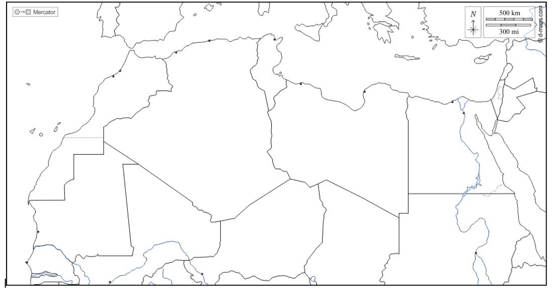North Africa and the Middle EastOnline version Map Quiz Practice by Mary Anne McGrory 1 Portugal 2 Spain 3 Mediterranean Sea 4 Morocco 5 Western Sahara 6 Algeria 7 Tunisia 8 Libya 9 Mauritania 10 Mali 11 Niger 12 Chad 13 Egypt 14 Sudan 15 Nile River 16 Atlantic Ocean 17 Red Sea 18 Israel 19 Jordan 20 Syria 21 Greece 22 Italy 23 Turkey