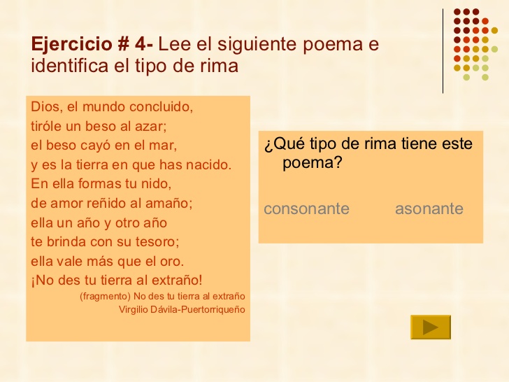 Es la repetición de los últimos sonidos de cada verso a partir de la última sílaba tónica.