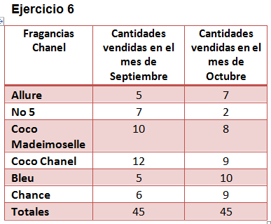 Probabilidades y EstadísticasOnline version Fragancias Chanel propone a los clientes una diversidad de productos de buena calidad para preguntarle que olores son preferidos o favoritos a la hora de comprar. by Oswaldo Turizo Jimenez 1 De los últimos 45 envases para lociones producidos por Fragancias Chanel, 5 eran defectuosos (D) y los envases restantes eran buenos (B). Se tomará un envase de esencia al azar para inspeccionarlo. ¿Cuál es la probabilidad de que el envase seleccionado sea defectuoso? .¿Y de que sea bueno? a Bueno 0.72 defectuoso: 0.22 b Bueno: 0.66 defectuoso: 0.36 c Bueno: 0.89 defectuoso 0.11 d Bueno: 0.11 defectuoso 0.89 2 Al entrevistar a 100 personas, clientas de la perfumería Chanel, se observó que 75 de ellas usan la fragancia No 5 Chanel (A), 55 Coco Madeimoselle y 10 ninguna de ellas. ¿Cuántos clientes usan ambas? a 40 b 65 c 56 d 30 3 En una entrevista efectuada por teléfono se encontró que 77 personas prefieren la fragancia Coco Chanel (A), 44 la fragancia Allure (B) y 13 tanto A como B.¿Cuántas personas prefieren por lo menos uno de estos productos? a 0.78 b 0.88 c 1 d 0.55 4 Según los datos de la tabla; la probabilidad de vender la fragancia Coco Chanel en los dos meses fue de: a 0.98 b 0.48 c 0.25 d 0.47 5 En un lote de 20 fragancias de Bleu de Chanel hay 3 defectuosas ya que su envase está deteriorado y la tapa no cumple su función. ¿Cuál es la probabilidad de seleccionar al azar una fragancia Bleu de Chanel no defectuosa? a 0.85 b 0.98 c 0.67 d 0.66