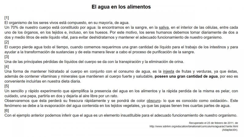 El agua en los alimentos 5toOnline version Leemos y analizamos textos escritos. by MIGUEL ANGEL MENDOZA CARBAJAL 1 ¿Cuál es el tema central del texto? a El agua como elemento fundamental en la composición y funcionamiento del organismo. b La transpiración y la orina como procesos que provocan la pérdida de líquidos. c La ejemplificación del proceso de oxidación. 2 ¿En qué porcentaje el cuerpo humano está compuesto por agua? a En un 50%. b En un 60%. c En un 70%. 3 En la palabra deshidratación, ¿qué significado tiene el prefijo des? a Carencia. b Negación. c Oposición. 4 Según el texto, la transpiración es: a una transformación de sustancias b un problema glandular. c un factor de pérdida de agua en el cuerpo humano. 5 ¿Cuál de las palabras subrayadas en el texto está escrita incorrectamente? a Saliva. b Injesta. c Obscuro. 6 ¿A quién hace referencia la frase del párrafo [4] escrita en negritas? a A las frutas y verduras. b A las vitaminas y los minerales. c A los alimentos. 7 Elige la opción que representa el concepto de transpiración. a b c 8 El agua en nuestro cuerpo no la encontramos en: a La sangre. b La saliva. c El interior de las células. d Los recervorios. 9 Nuestro cuerpo pierde agua cuando... a comemos ya que requerimos una gran cantidad de líquido para el trabajo de los intestinos y para ayudar a la transformación de sustancias. b hacemos ejercicios. c nos exponemos demasiado a la luz solar. 10 El agua para nuestro cuerpo es: a Un líquido que debemos consumir de vez en cuando. b Un líquido que se puede reemplazar por cualquier otro líquido para calmar la sed. c Un recurso que debemos tomar para calmar la sed durante la época de calor. d Un elemento insustituible para el adecuado funcionamiento de nuestro organismo.