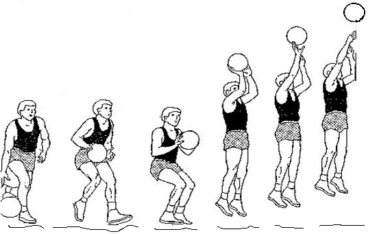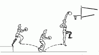 Lanzamiento a canasta tras elevarse en el aire, apoyando el balón en una mano mientras se sujeta con la otra, finalizando el lanzamiento con un característico golpe de muñeca.