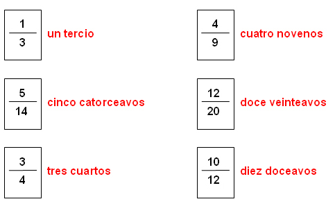 El número que está en el numerador se lee igual, no así el denominador. Cuando el denominador va de 2 a 10, tiene un nombre específico (si es 2 es "medios", si es 3 es "tercios", si es 4 es "cuartos", si es 5 es "quintos", si es 6 es "sextos", si es 7 es "séptimos", si es 8 es "octavos", si es 9 es "novenos", si es 10 es "décimos"), sin embargo, cuando es mayor que 10 se le agrega al número la terminación "avos".
