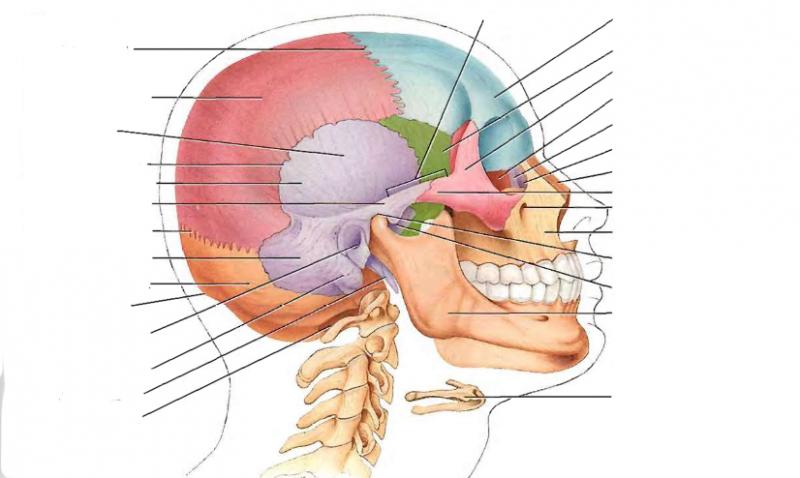 1 Sutura coronal 2 Hueso parietal 3 Escama del temporal 4 Sutura escamosa 5 Hueso temporal 6 Apófisis cigomática 7 Sutura lambdoidea 8 Porción mastoidea 9 Hueso occipital 10 Protuberancia occipital externa 11 Conducto auditivo externo 12 Apófisis mastoides 13 Apófisis estiloides 14 Foramen magno (agujero occipital) 15 Arco cigomático 16 Hueso frontal 17 Hueso esfenoides 18 Hueso cigomático 19 Hueso etmoides 20 Hueso lagrimal 21 Surco lagrimal 22 Hueso nasal 23 Apófisis temporal 24 Foramen infraorbitario 25 Hueso maxilar 26 Fosa mandibular 27 Tubérculo articular 28 Mandíbula 29 Hueso hioides