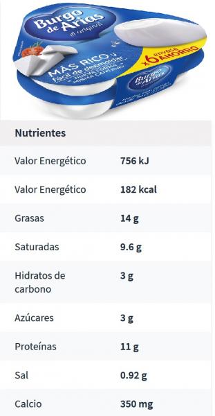 ¡Corre! Uno de tus camaradas tiene una bajada de glucosa. Lo primero que encuentras es queso fresco. Teniendo en cuenta que su Índice Glucémico es 35 y la etiqueta nutricional mostrada (por cada 100g), ¿le haces a tu compañero una tostada con queso fresco o prefieres seguir buscando?