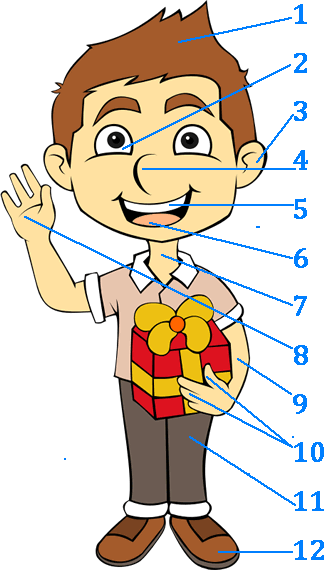Colocanos en nuestro sitioOnline version Coloca cada parte del cuerpo en el numero que le corresponde. by Noemi Cano 1 Pelo 2 Ojo 3 Nariz 4 Oreja 5 Dientes 6 Boca 7 Cuello 8 Mano 9 Brazo 10 Dedos 11 Pierna 12 Pie