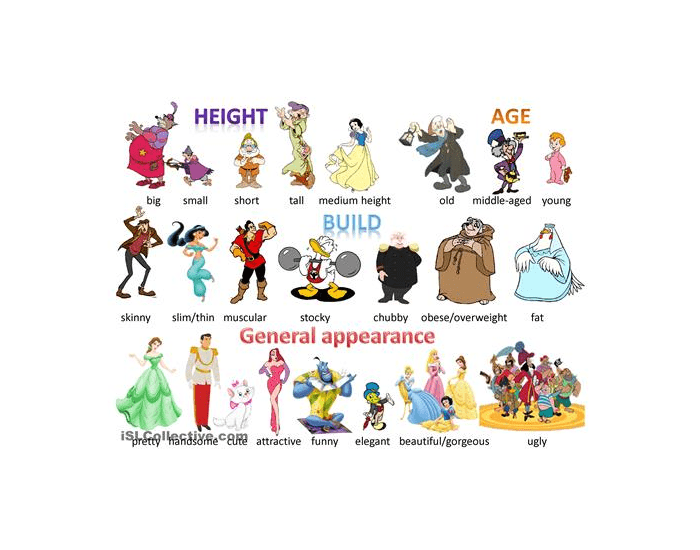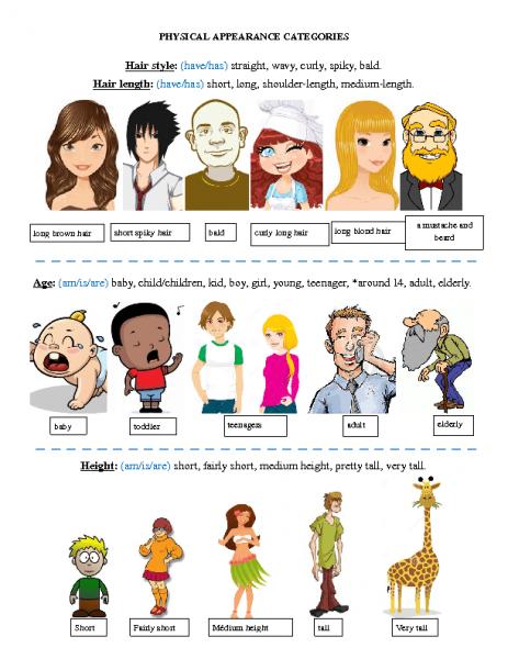 características físicas Online version Aquí tienes algunas palabras en inglés que puedes usar cuando describas la apariencia de alguien o su personalidad, así como también palabras para diferentes sentimientos. by fernando daniel gonzalez 1 Physical characteristics To describe peopleHere are some words in English that you can use when describing someone's appearance or personality, as well as words for different feelings. 2 Describiendo personas - Tabla de características físicas (ESL para adultos) 3 Physical description 4 tipos de características faciales Características físicastallalto/ashortbajo/aslimdelgado/athinflaco/afatgordo/aobeseobeso/awell-builtfornido/aoverweightcon sobrepesomedium heightde talla mediawell-dressedbien-vestido/asmartelegantescruffydesaliñadogood-lookingbuen parecido/aattractiveatractivo/abeautifulbello/aprettyguapahandsomeguapouglyfeo/aoldviejo/ayoungjovenmiddle-agedde mediana edadbaldcalvo/abald-headedcon la cabeza calvabeardbarbamoustachebigotelong hairpelo largoshort hairpelo cortostraight hairpelo lisocurly hairpelo rizadofair-hairedde pelo rubioblond-haired o blonde-hairedde pelo rubiobrown-hairedde pelo castañodark-hairedde pelo morenoginger-hairedpelirrojo/ablonderubio/abrunettemoreno/aredheadpelirrojo/aSentimientoshappyfelizsadtristemiserablemuy tristeworriedpreocupado/adepresseddeprimido/aexcitedexcitado/aboredaburrido/afed upharto/apleasedsatisfecho/adelightedmuy contento/asurprisedsorprendido/aastonishedasombrado/adisappointeddecepcionado/aenthusiasticentusiasmado/arelaxedrelajado/astressedestresado/aanxiousansioso/atiredcansado/awearyagotado/aexhaustedmuy cansado/aannoyedmolesto/aangryenfadado/afuriousfurioso/alividlívido/adisgustedasqueado/a, indignado/a 5 To be y to have To be y to haveUsamos el verbo to have para hablar de: el pelo, la piel, los ojos, es decir, los rasgos faciales o corporales que tenga la persona. Sin embargo, con las palabras que acaban en -ed, comoblonde-haired o short-sighted porque se utiliza el verbo to be 6 Ejemplos Ejemplos:She has got brown eyes and short brown hair - Ella tiene los ojos marrones y el pelo corto y castaño.He is blonde - Él es rubio. How would you define your hair colour? - ¿Cómo definirías tu color de pelo?What are you like? - ¿Cómo eres tú?What does he/she look like? - ¿Qué aspecto tiene el/ella?He is young - Él es joven.She is 20 years old - Ella tiene 20 años.My father is old - Mi padre es viejo.You are bald - Tú eres calvo.He has long hair - Él tiene el pelo largo.My sister has curly hair - Mi hermana tiene el pelo rizado.I don't have a mustache - Yo no tengo bigote.