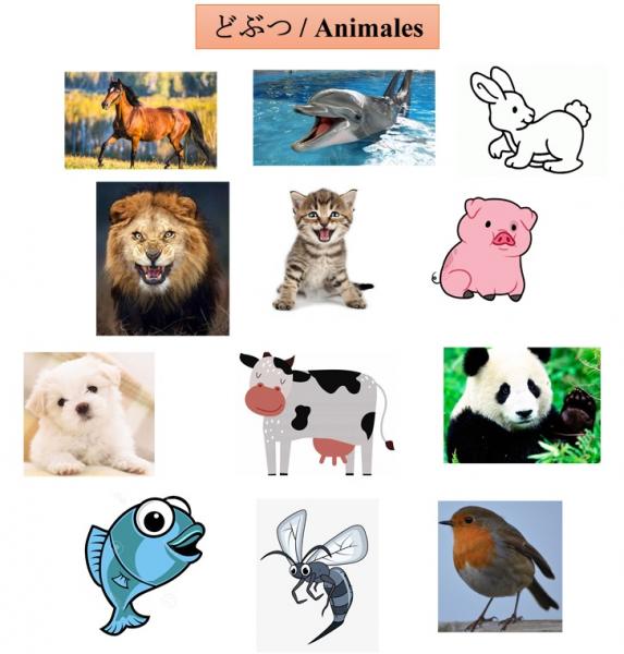 どぶつ / AnimalesOnline version Encuentra los animales by Language Center 1 うま 2 ぶた 3 うさぎ 4 いるか 5 ねこ 6 ライオン 7 ぱんだ 8 うし 9 とり 10 いぬ 11 さかな 12 むし