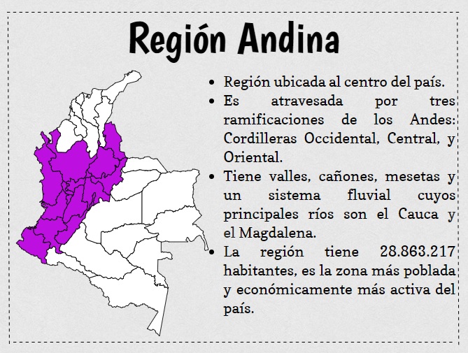 Crossword Puzzle REGIÓN ANDINAOnline version La región andina abarca los departamentos de Antioquia, Caldas, Risaralda, Quindío y Antioquia (Eje Cafetero), Nariño, Huila, Tolirna, Cundinamarca, Boyacá, Santander y Norte de Santander. by Maria Cristina CASTILLEJO ROYERO 1 2 Es una de las danzas y canto folclórico más representativo de Boyacá, Cundinamarca y Santander. 3 son coplas picarescas de los opitas, las cuales se interpretan con flautas, tiples, tamboras y caránganos. 4 Los instrumentos típicos para la ejecución de la guabina son el tiple y el requinto, la bandola y el chucho o guache, a veces reemplazado por la pandereta. 5 6 2 5 1 4 6