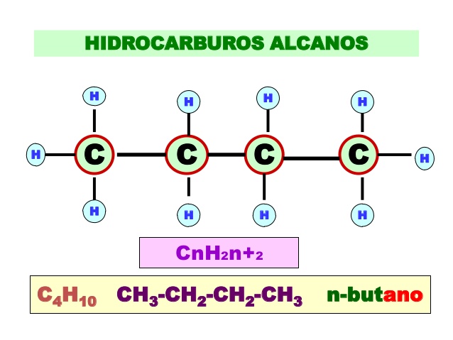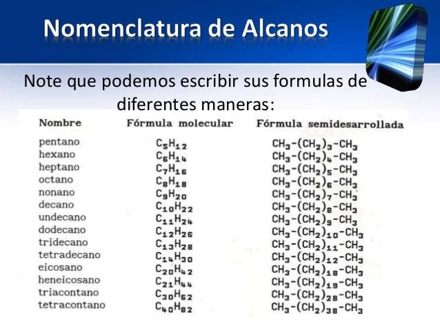 El nombre de un alcano está compuesto de dos partes, un prefijo que indica el número de carbonos de la cadena seguido del sufijo -ano que caracteriza este tipo de compuestos, (met-ano, et-ano, prop-ano, but-ano).