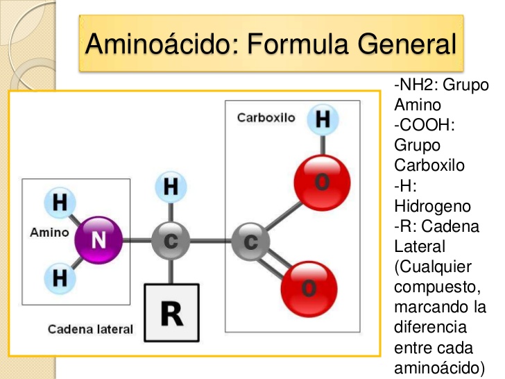 los aminoácidos  son las unidades básicas que forman las proteínas. Su denominación responde a la composición química general que presentan, en la que un grupo amino (-NH2) y otro carboxilo o ácido (-COOH) se unen a un carbono α (-C-). Las otras dos valencias de ese carbono quedan saturadas con un átomo de hidrógeno (-H) y con un grupo químico variable al que se denomina radical (-R).