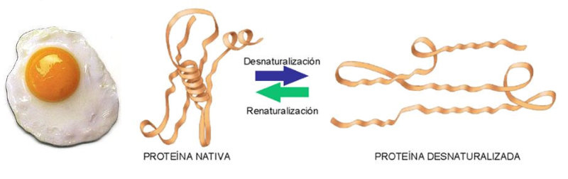 Desnaturalización. Consiste en la pérdida de la estructura terciaria, por romperse los puentes que forman dicha estructura., se puede producir por cambios de temperatura,  variaciones del pH. En algunos casos, si las condiciones se restablecen, una proteína desnaturalizada puede volver a su anterior plegamiento o conformación, proceso que se denomina renaturalización.