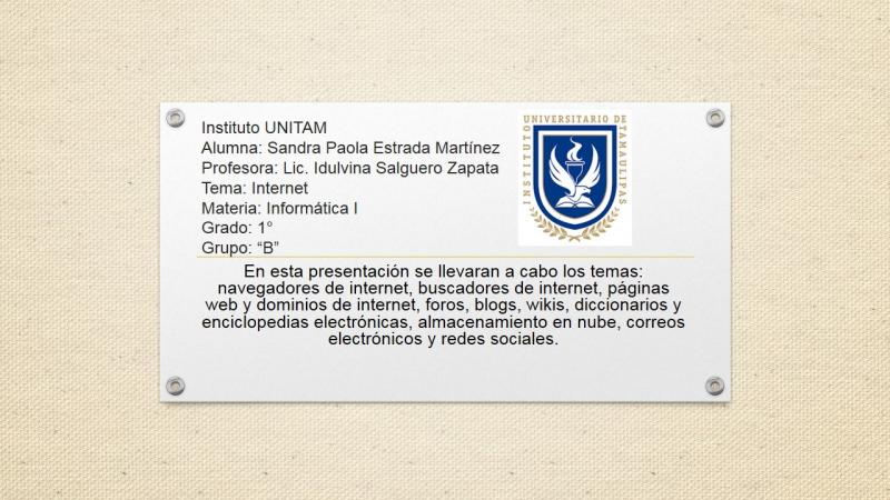 InternetOnline version Esta presentación contiene los siguientes temas: wikis, blogs, foros, páginas web, navegadores de internet, buscadores de internet, dominios de internet, redes sociales, etc. by Sandra Paola Estrada Martinez 1 Presentación 2 Navegadores de internet 3 Características de los navegadores 4 Ejemplos de navegadores 5 Buscadores de internet 6 Características de los buscadores 7 Ejemplos de buscadores 8 Página web 9 Características de las páginas web 10 Ejemplos de páginas web 11 Dominios de Internet 12 Características de los dominios de Internet 13 Ejemplos de los dominios de Internet 14 Foros de Internet 15 Características de los foros de Internet 16 Ejemplos de los foros de Internet 17 Creación de foros de Internet 18 Blogs 19 Características de los blogs 20 Ejemplos de blogs 21 Creación de un blog 22 Wikis 23 Características de las wikis 24 Ejemplos de wikis 25 Creación de wikis 26 Diccionarios y enciclopedias electrónicas 27 Características de los diccionarios electrónicos 28 Ejemplos de diccionarios electrónicos 29 Características de las enciclopedias electrónicas 30 Ejemplos de enciclopedias electrónicas 31 Almacenamiento en nube 32 Características del almacenamiento en nube 33 Ejemplos de almacenamiento en nube 34 Correo electrónico 35 Características del correo electrónico 36 Redes sociales 37 Características de las redes sociales 38 Ejemplos de redes sociales