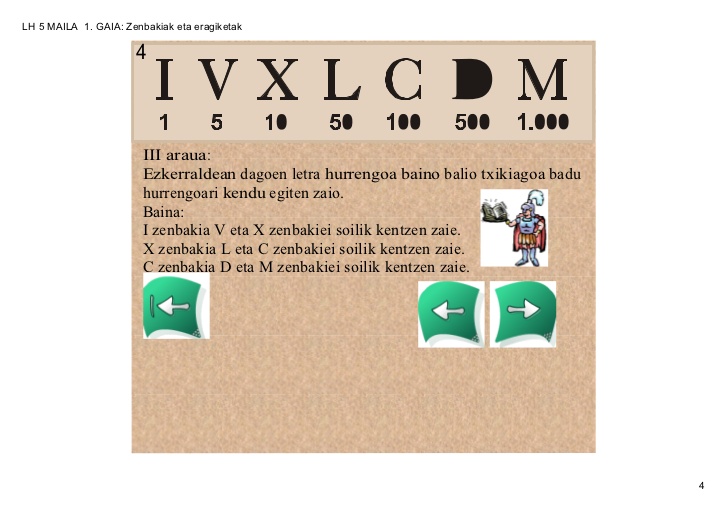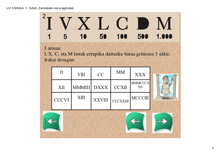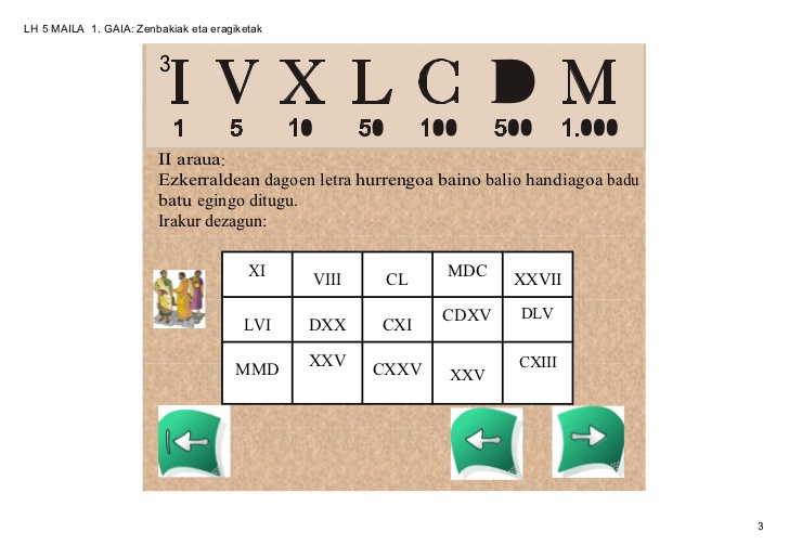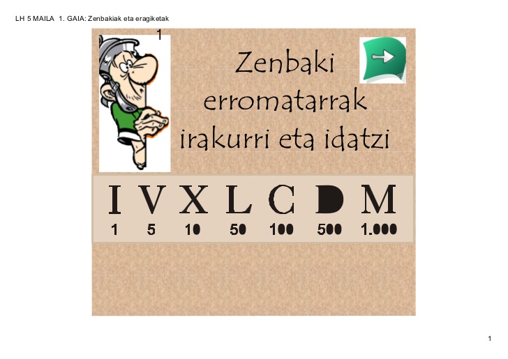 ZENBAKI ERROMATARRAKOnline version Zeintzuk dira zenbaki erromatarrak? by oihanah hermoso 1 ZENBAKI ERROMATARRAK Erromatar zenbakera erromatarrek garatu zuten zenbaki-sistema da. Zenbakiak idazteko hainbat letra larri erabiltzen dira. Gaur egun mendeak idazteko erabiltzen ditugu erromatar zenbakiak, eta baita, erloju analogiko askotan ere.Erromatarrek ez zuten 0 zenbakia ezagutzen, eta horretxegatik ez dago zenbaki hori adieraziko duen hizkirik. 2 ZENBAKI ERROMATARRAK 3 ZENBAKI ERROMATARRAK 4 ZENBAKI ERROMATARRAK 5 ZENBAKI ERROMATARRAK 6 ZENBAKI ERROMATARRAK Ariketekin hasi aurretik bideo honen bitartez azken errepasoa egingo dugu.