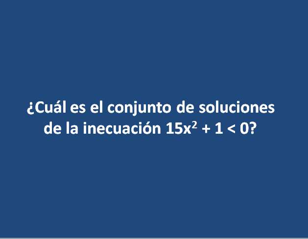 INECUACIONESOnline version Preguntas acerca de las inecuaciones by María Mar Viguera Argaiz 1 ¿Cuál es el conjunto de soluciones de la inecuación que vemos en el archivo adjunto? a Dos puntos de la recta real b Un intervalo de la recta real c El conjunto de todos los números reales d El conjunto vacío 2 La inecuación 2x + 11 < -x + 20 es equivalente a: a 2x < 5x + 9 b 3x < 9 c x > 3 3 ¿Cómo se llama la expresión algebraica que expresa una desigualdad? a Sistema de ecuaciones b Radical c Inecuación d Ecuación 4 La solución de la inecuación 3x + y > 5 es: a Los puntos de la recta de ecuación y = 5 - 3x. b El semiplano que está a la derecha de la recta de ecuación y = 5 - 3x. c El semiplano que está a la izquierda de la recta de ecuación y = 5 - 3x 5 La solución de la inecuación y - 2x + 4 > 0 es: a b c 6 ¿Cómo se representa la solución de una inecuación con una incógnita? a Mediante los puntos de una semirrecta b Mediante los puntos de un semiplano c Mediante dos puntos d Mediante un punto 7 ¿Cuál de los siguientes puntos está en el semiplano que determina la inecuación 3x + 2y > 5? a (1,1) b (2,1) c (0,0) d (-1,1) 8 Indica cuál de las siguientes inecuaciones es equivalente a -3x + 1 < 2x: a 3x - 1 < -2x b -3x - 1 > -2x c 3x - 1 > - 2x d 3x + 1 > -2x 9 ¿En qué intervalo es negativo la expresión de segundo grado a Los menores que 5 b En ninguno, es siempre positivo c En toda la recta real, es siempre negativo d Los menores que -5 10 La inecuación -2x + 3 < -5x es equivalente a: a x < -1 b 3x < 3 c 2x < 5x + 3