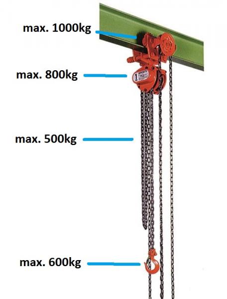 Wat is de maximaal toelaatbare belasting van deze opstelling met handtakel?