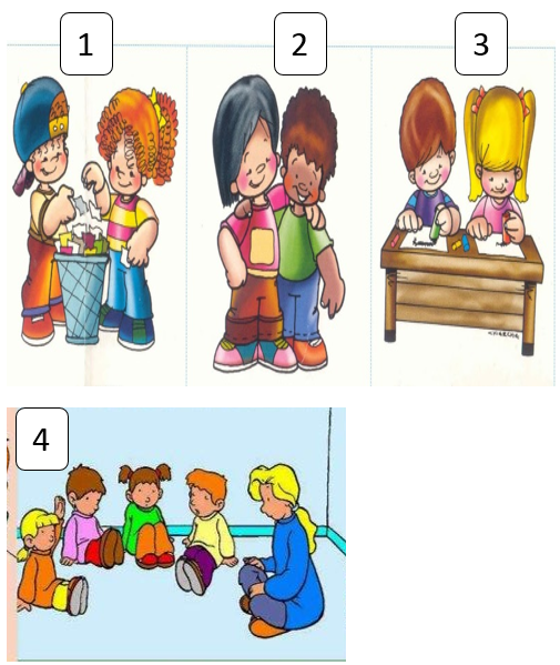 2019-1P D.Socioafectiva-J-EOnline version Observa las imágenes y responde a las preguntas by Andec Ingeniería SAS 1 Una norma dentro del salón de clases es mantener el aula limpia, la imagen que lo representa es: a La número 3 b La número 2 c La número 1 d La número 4 2 Cuando un compañero pide la palabra, lo escuchamos con respeto, la imagen que la representa es: a La número 1 b La número 4 c La número 2 d La número 3 3 Debemos mantener nuestro sitio de trabajo organizado y compartir con nuestros compañeros la imagen que lo representa es: a La número 3 b La número 1 c La número 4 d La número 2 4 A nuestros amigos debemos respetar, la imagen que lo representa es: a La número 4 b La número 3 c La número 1 d La número 2 5 Para una sana convivencia debemos: a Ser groseros con nuestros amigos b Respetar las normas de convivencia c Hacer desorden en el salón d Irrespetar a mis compañeros
