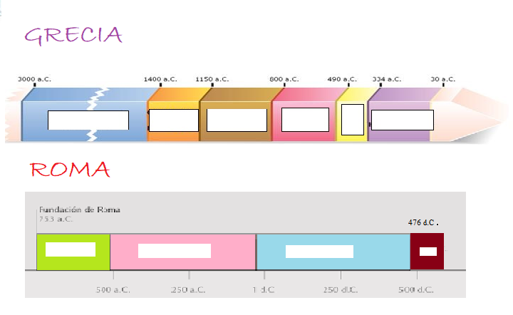 Lío cronológico Online version Completa el eje cronológico de las civilizaciones griega y romana. Deberás pinchar en el cuadrado correspondiente la etapa indicada. Tendrás dos intentos durante el juego. by Elena Piñero Parra 1 Grecia arcaica 2 Grecia clásica 3 Grecia helenística 4 Época oscura 5 Civilización micénica 6 Civilización minoica 7 Monarquía 8 República 9 Imperio 10 Caída del Imperio romano de Occidente